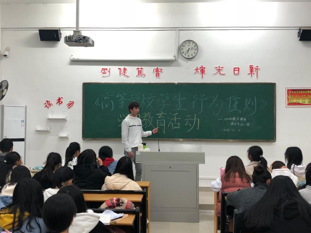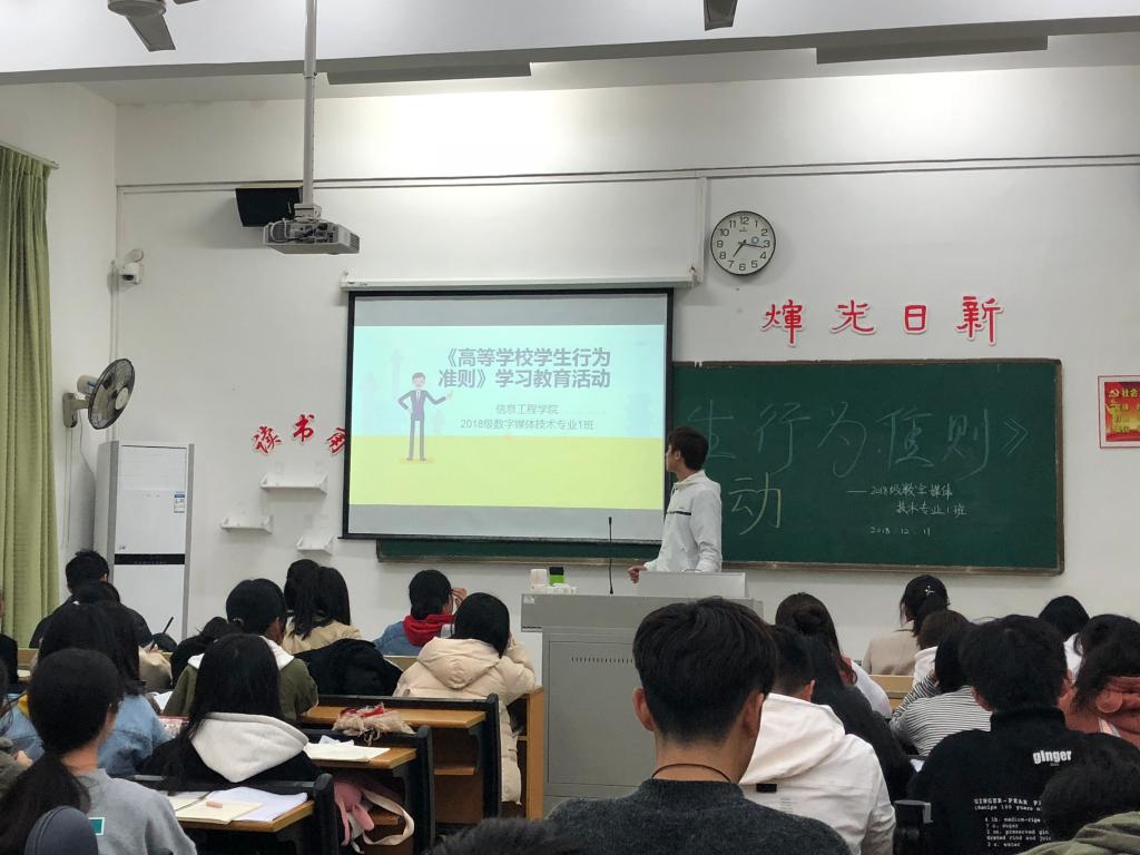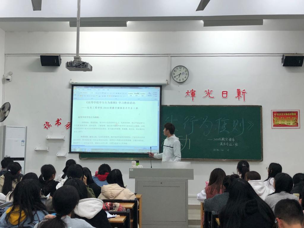 2018年12月11日晚,工科楼B楼的204教室里传出这样一段话:“作为新时代的大学生,我们应当有怎样的前进目标、上进精神和行为规范?”随着2018级数字媒体技术专业1班班长张梓杰的提问,信息工程学院2018级数字媒体技术专业1班的全体同学们在教室里开展了“《高等学校学生行为准则》学习教育活动”。