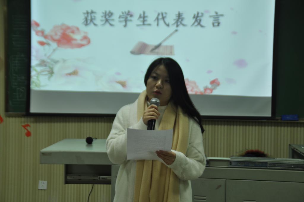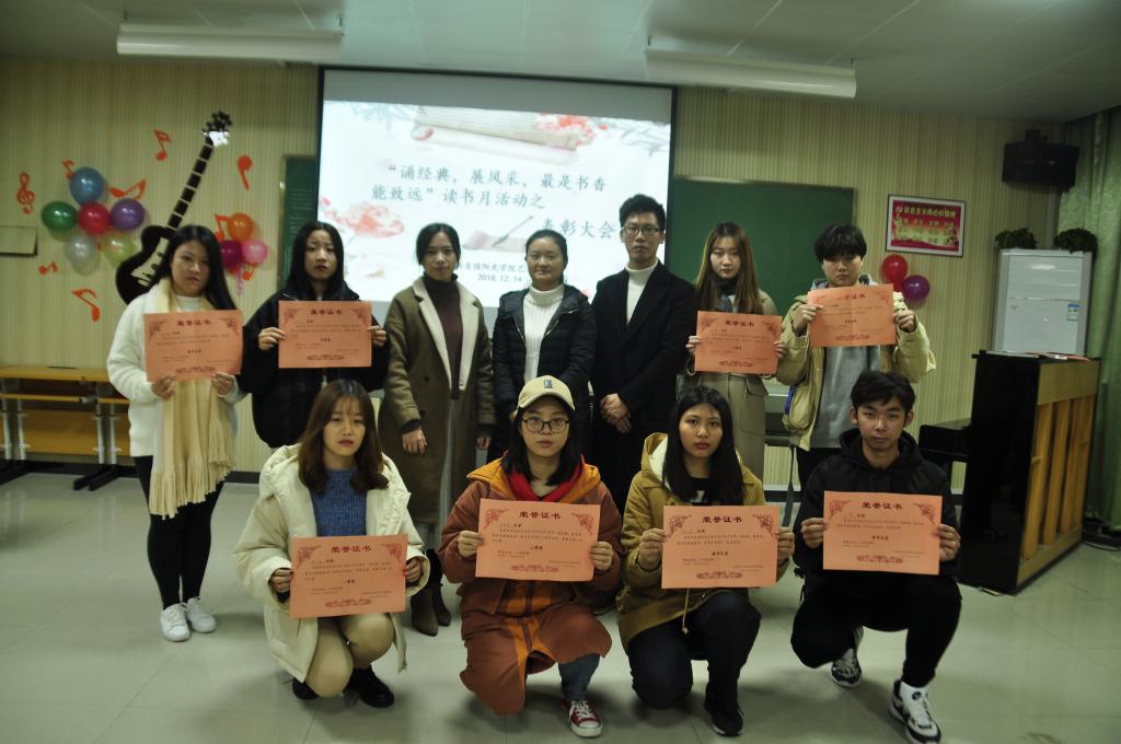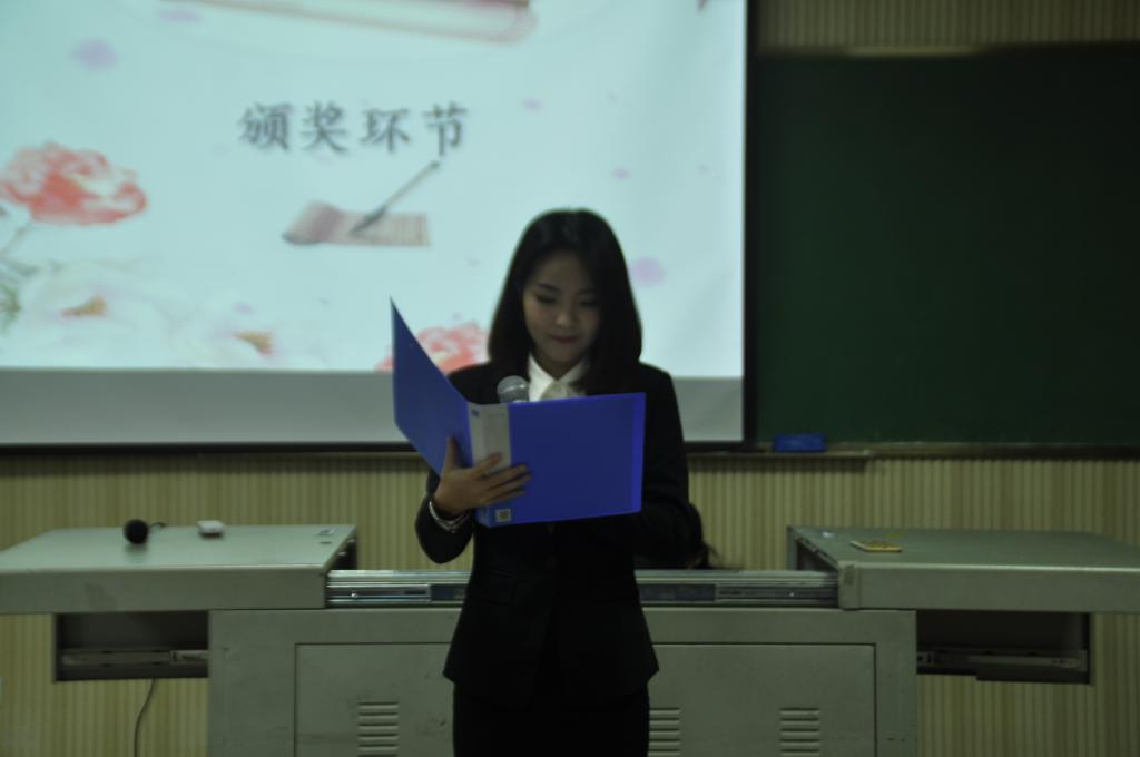 表彰大会在一首古典歌曲《芊芊》拉开大会序幕,一段小视频记录着读书月时的点点滴滴。本次表彰包括国学月演讲比赛;“我的大学青春飞扬”的征文比赛;“国学经典”的课间活动,“红色经典”的读书之星评比以及超级找书王一系列活动。在本次活动中,18级音乐学陈思哲同学获得国学月演讲比赛最佳朗诵者,18级美术学黄少君、李珺晓、陈璐、18级音乐学朱凤四名同学在“我的大学,青春飞扬”征文活动中表现突出,分别获得一等奖、二等奖、三等奖及优秀奖,17级音乐一班和18级美术一班分别荣获书香班级荣誉称号,17级音乐学林子璟、17级舞蹈学陈巧芳、17级美术学田博三名同学分别荣获“红色经典”读书之星荣誉称号,17级美术学吴镕、18级美术学彭博洋、17级舞蹈学陈琦分别荣获“超级找书王”荣誉称号。活动的最后,宋海霞老师总结发言,对本次活动的不足之处进行了指点。