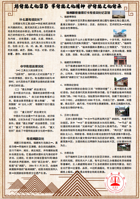 在此次活动中,阳光学院法律系学生代表参观了福建省博物馆,详细了解福建从远古到鸦片战争以前的发展脉络,感受其深处的历史之光,对重塑社会主义革命本色与真诚具有良好的教育与深远的教育意义。走访位于福州三坊七巷的阳光学院大学生传统文化教育示范基地——福建省民俗博物馆,参观独具福建特色的马鞍墙、拔步床等,感受福建省民俗文化之美。最后一站,林则徐纪念馆,学生代表通过实地走访,同游客一起对林则徐文化进行的探讨,学习林则徐文化,感受民族英雄林则徐的爱国、奉献、奋斗的英勇气概,对当代大学生树立艰苦奋斗的精神具有深远的意义。活动最后,学生代表向各地游客分发中华优秀传统文化宣传单,通过实际行动推广中华优秀传统文化。