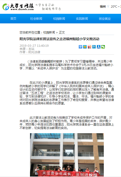 【外媒报道】大学生网报:阳光学院法律系普法宣传之走进福州魁岐小学义教活动