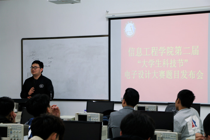 为了促进信息工程学院学科课程体系和课程内容的改革,培养大学生的实践创新意识与基本动手能力,让同学们体会到电子学的奥秘从而促进同学们对电子技术的认识,我院于2019年3月29日14:00在29号楼401开展了第二届“大学生科技节”电子设计大赛开幕式。