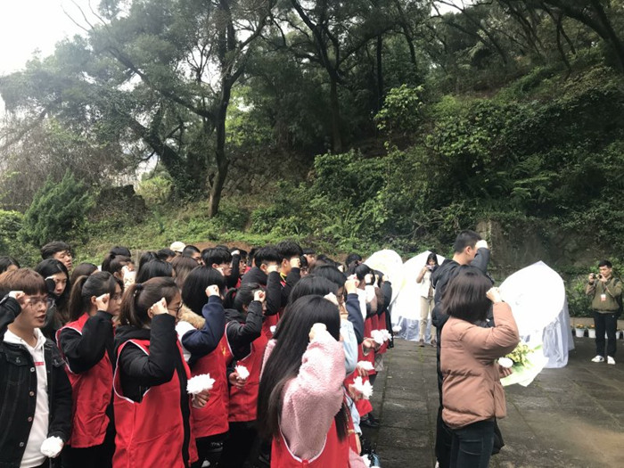 到达马尾烈士陵园后,仰目可见矗立的烈士纪念碑,立于陵园中心的高峰之巅,气势磅礴,在巍峨的纪念碑前,党员们整齐列队,凝望着镌刻着烈士名字的英烈纪念墙,开展主题祭扫活动。首先,由代表致辞,全体人员到纪念碑前肃立。全体师生向革命烈士鞠躬默哀默哀三分钟,共同缅怀革命先烈的英灵,以表对先烈们做出的牺牲和奉献表示崇高的敬意。随后,在第一学生党支部书记黄明月同志的带领下,庄严宣誓,重温了入党誓词,坚定历史责任感和民族使命感。最后,在第二学生党支部书记吕延同志的带领下,党员们向革命烈士敬献了小白花,并在烈士碑前集体肃立向革命烈士默哀,缅怀革命烈士。活动在庄严肃穆的气氛中结束。