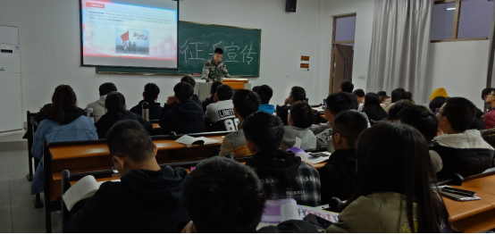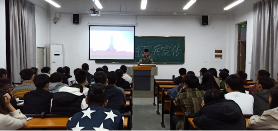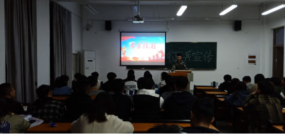 在会议开始之前,观看了关于征兵的部队宣传视频。观看后朱弢同学讲述参军的重要意义——“没有这些军人就没有祖国的大好河山”,并且介绍了参军的相关优惠政策,对就学就业和资金补助等方面政策进行了详细的解释说明。最后阐述了参军所需要具备的条件,会场气氛十分热烈,充分地调动同学们报名参军的积极性。