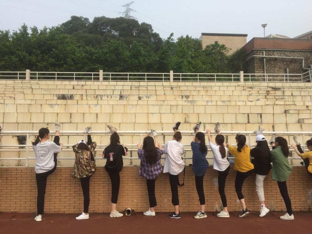 艺术系的学生晨练必须来点“艺术绝活儿”。“一、二、三,上墙,抱住!”快看,那一排笔直的大长腿就是我们艺术系舞蹈专业的学生在展示他们的绝活儿!身姿婀娜,又不失刚健,尽展艺术练家的气质,羡煞他人!在展示完压腿的基本功后,舞蹈专业的学生现场教授其他同学进行压腿训练,虽然一开始有点疼痛,但是循序渐进,动作规范,持之以恒,定能更好地塑身健体。