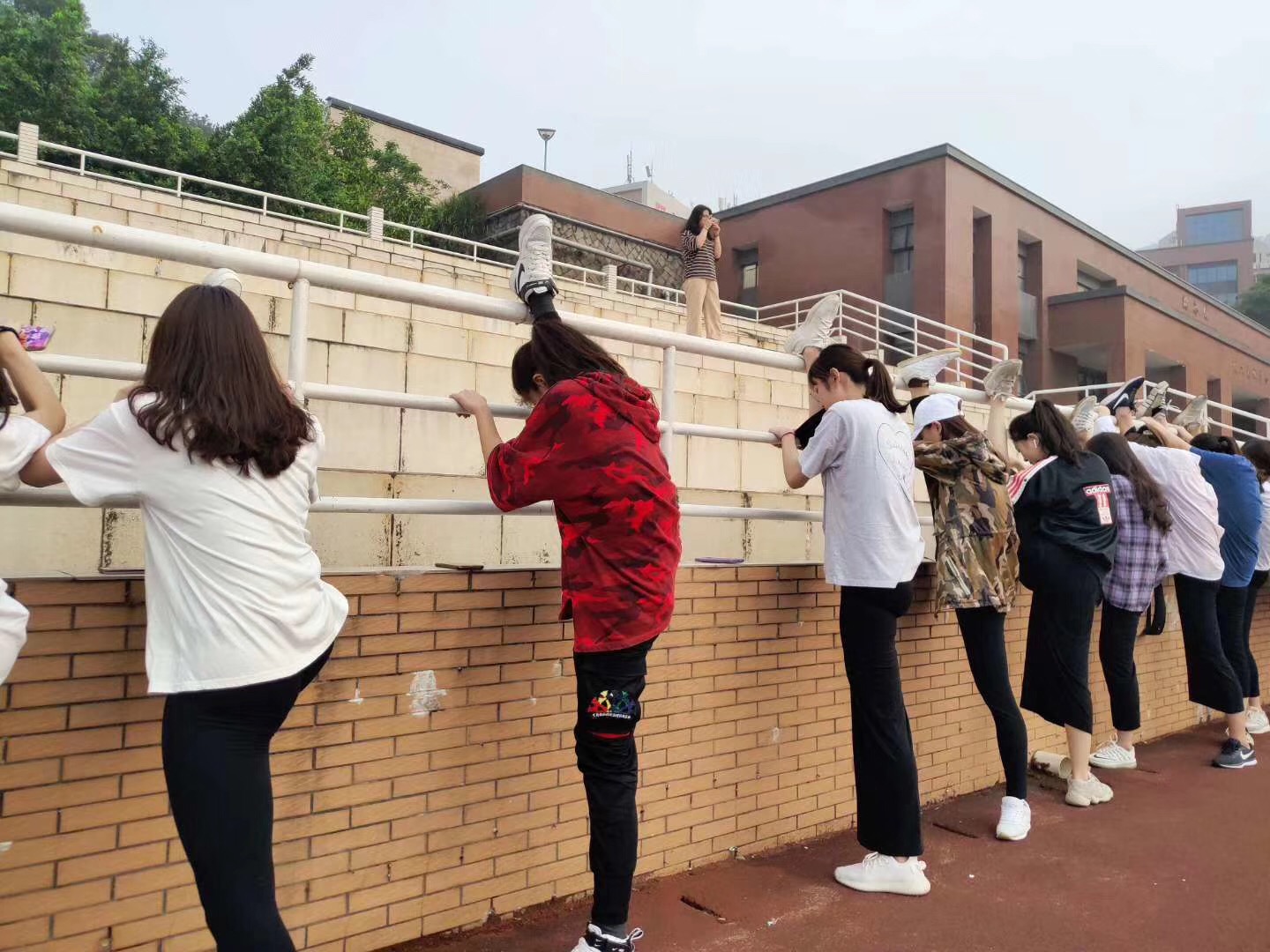 A:你见过清一色大长腿压一字马的晨练吗?