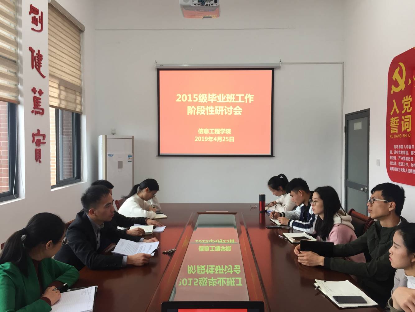 为使2015级毕业工作顺利进行,信息工程学院党总支书记林辉宗老师及全体辅导员于2019年4月25日,在工A405会议室召开了2015级毕业班工作阶段性研讨会。