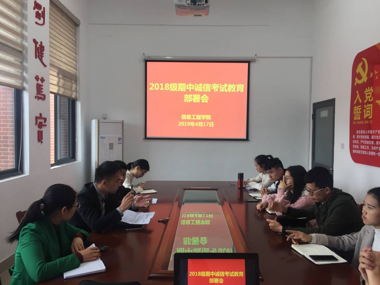 为迎接即将到来的期中考试,进一步提高教育教学水平,检查并总结前半学期的教学情况,践行社会主义核心价值观。信息工程学院于2019年4月17日在工A405会议室召开了2018级期中诚信考试教育部署会,出席老师是信息工程学院党总支书记林辉宗老师及全体辅导员们,此次会议由林辉宗老师主讲。