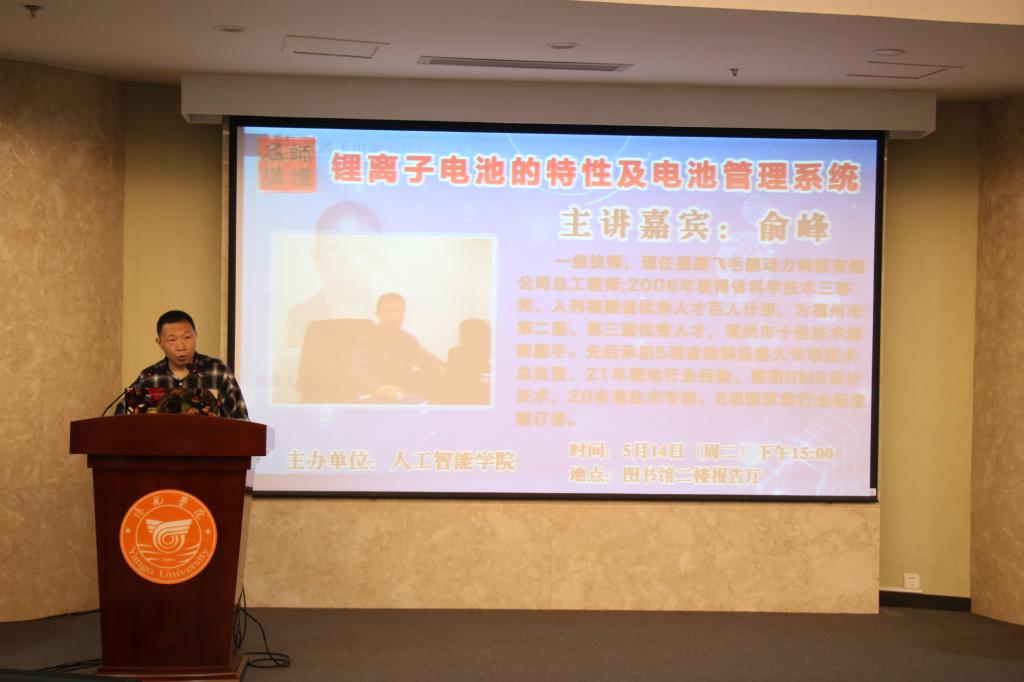 为提升我院学生能力,加强校企联动,2019年5月14日下午,我院荣幸邀请到现任福建飞毛腿动力科技有限公司的俞峰总工程师,开展主题为“锂离子电池的特性及电池管理系统”的专题讲座报告。出席讲座的还有我院各领导班子、专业教师、辅导员等成员出席,会议由人工智能学院党总支书记林辉宗老师主持。