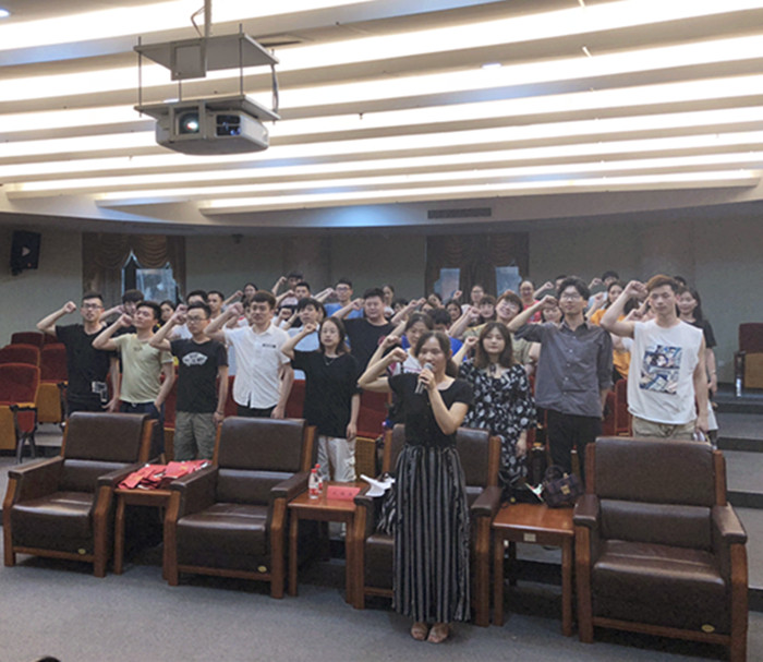 “不知同志们是否还记得,面对鲜红的党旗,紧握右拳诵读入党誓词的时刻,入党宣誓是成为中国共产党党员庄严而又神圣的组织程序”在叶润真老师的领誓下,全体毕业班党员重温了慷慨激昂的入党誓词。
