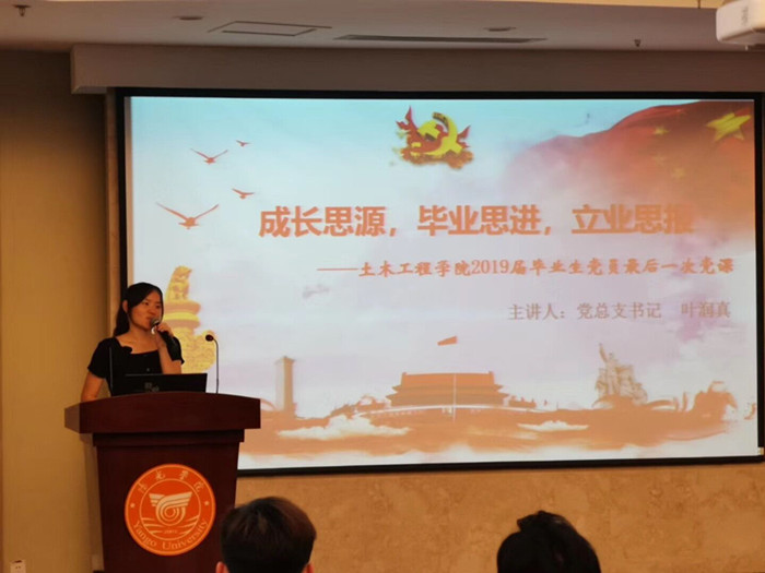 为深入开展毕业班党员“旗帜工程”,充分发挥毕业班党员在毕业季的模范带头作用,激励毕业班党员以昂扬的精神面貌走向新的工作岗位或开启新的学习生活,5月27日下午,土木工程学院党总支于图书馆二楼报告厅举办2019届毕业班党员离校前“最后一次党课”活动,党课由土木工程学院党总支书记叶润真老师主讲,全体毕业班党员同志参会。