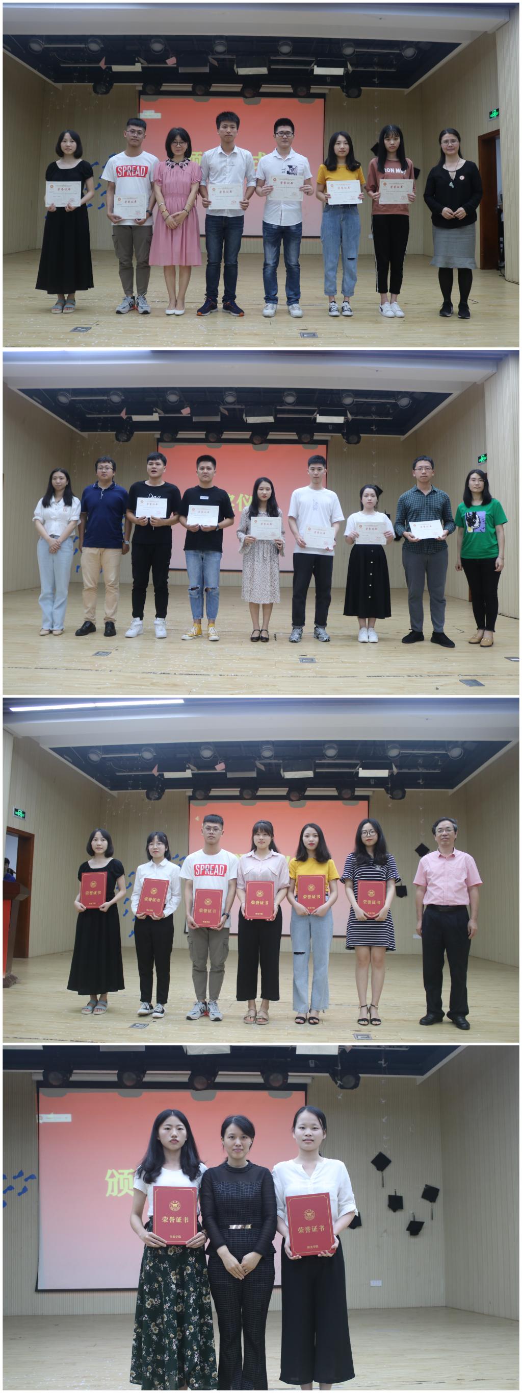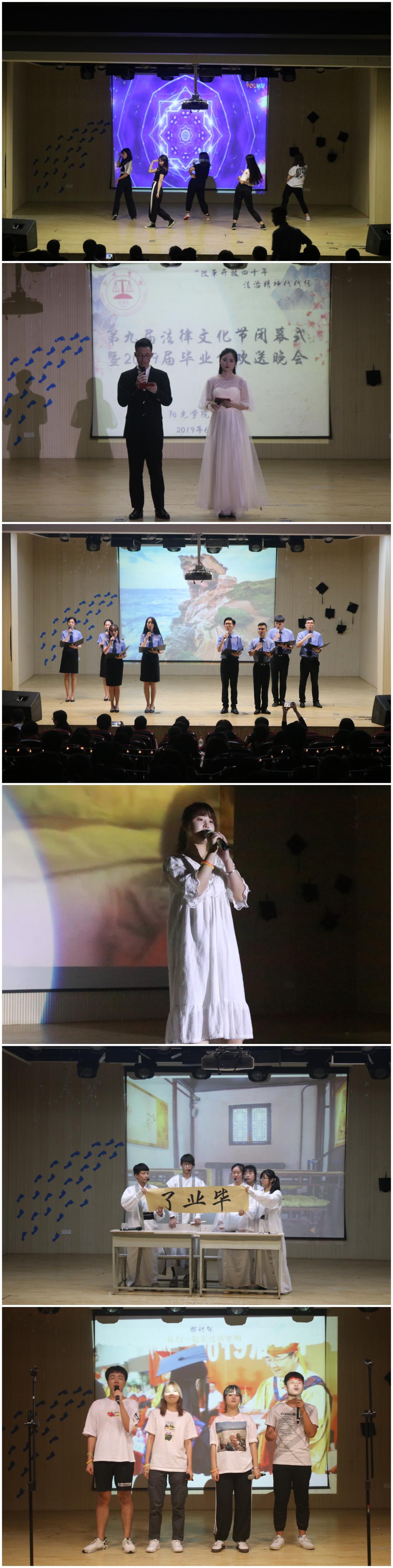 随后,毕业生欢送晚会拉开帷幕,独唱《时间煮雨》、小品《最后一堂课》和教师赠与毕业生临别寄语等节目陆续登场,让现场的大四学子感受到来自老师以及学弟学妹们最真挚的祝福。邹雄主任宣读关于阳光学院2019届优秀毕业生、优等生的表彰决定、并对2015级通过研究生升学考试、通过国家统一法律职业资格考试学生、优秀毕业论文及综合模拟法庭训练优秀成员予以表彰。今天的离别不是结束,而是新的开始。大学生活历历在目,放眼踏入社会的未来之路,虽然可能会坎坷不平,但这挡不住毕业生前进的步伐。祝福毕业学子一路阳光,未来可期,祝福法律文化节越办越好。