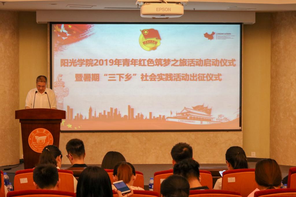 6月21日,阳光学院2019年青年红色筑梦之旅活动启动仪式暨暑期“三下乡”社会实践活动出征仪式在图书馆学术报告厅顺利举行。阳光学院党委书记陈少平、学生工作处处长杨海晋、各院系党总支书记、暑期社会实践指导老师、全体辅导员以及各院系实践队参加本次仪式。