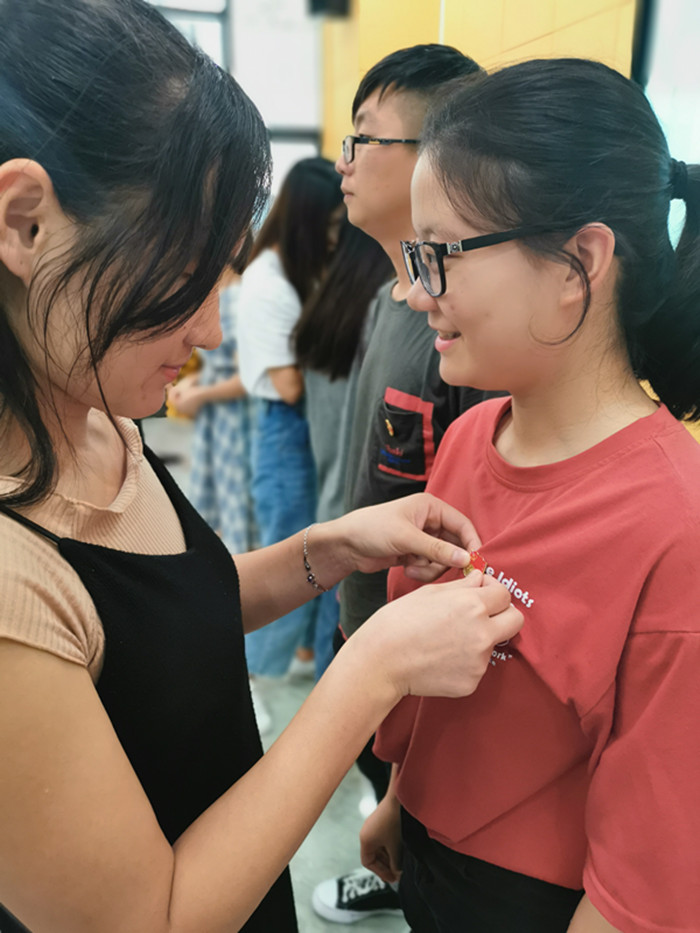 二是戴党徽,为强化党员主体意识,激发党员责任感和使命感,由总支书记、第一学生及第二学生党支部书记为每名与会党员现场佩戴党徽,党徽统一佩戴在党员左胸前醒目位置。