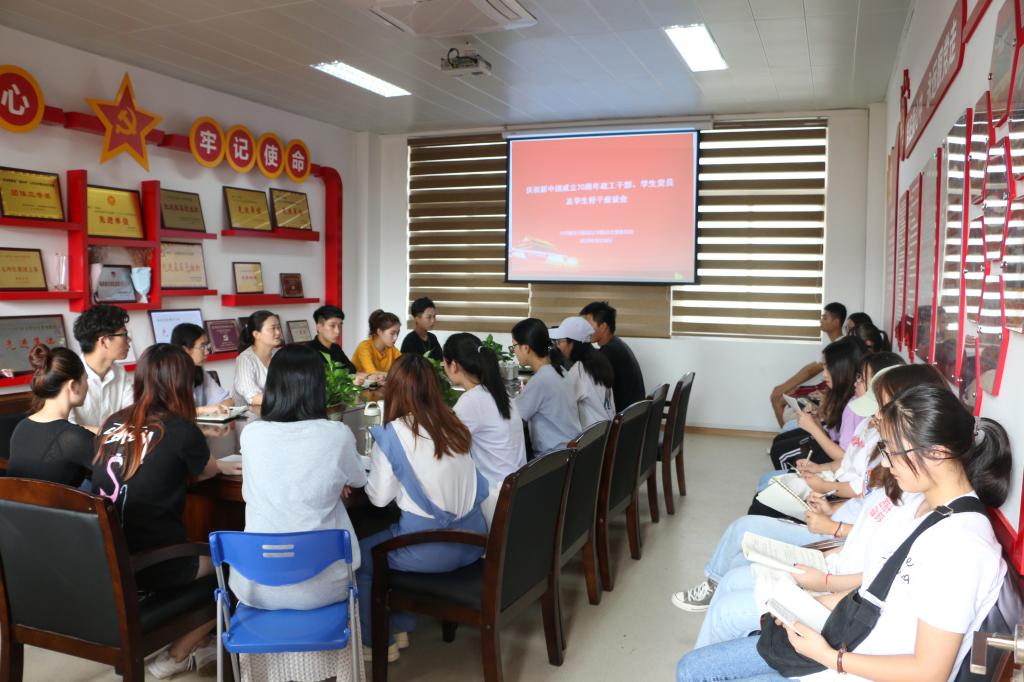 国庆即将到来之际,9月27日下午,设计学院在文科楼五楼会议室召开庆祝新中国成立70周年座谈会,党总支书记宋海霞、全体辅导员及学生党员、学生骨干参加了活动。