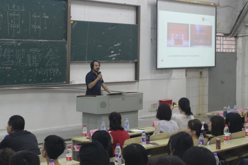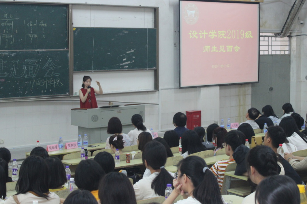 设计学院办公室主任兼团委书记吴其枝老师逐一向全体新生介绍了学院领导及老师。翁炳峰教授对260名本科新生的加入表示热烈欢迎,围绕学院简介、人才培养、教学条件、教学管理、学生获奖、学生就业等六个方面向新生介绍了设计学院的办学情况,引导全体新生尽快适应大学生活,合理规划大学生活。卢建涛副院长发言时谈到设计学院有“三有”:学科带头人有想法、教师团队有梦想、学生团队有朝气,希望全体新生紧跟学校应用型人才培养步伐,积累专业知识,强化实践技能。