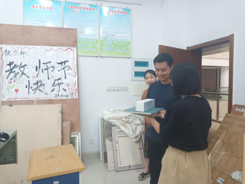 设计学院团委学生会为每位老师送上印有设计学院字样及全院教职工合影的爱心抱枕。三尺讲台育桃李,师生情会随着时间的流逝一直蔓延。“饮其流者怀其源,学其成时念吾师”,希望每位同学能够以满腔的热情投入到新学年的工作与学习中去,不负韶华是对老师最好的回馈。