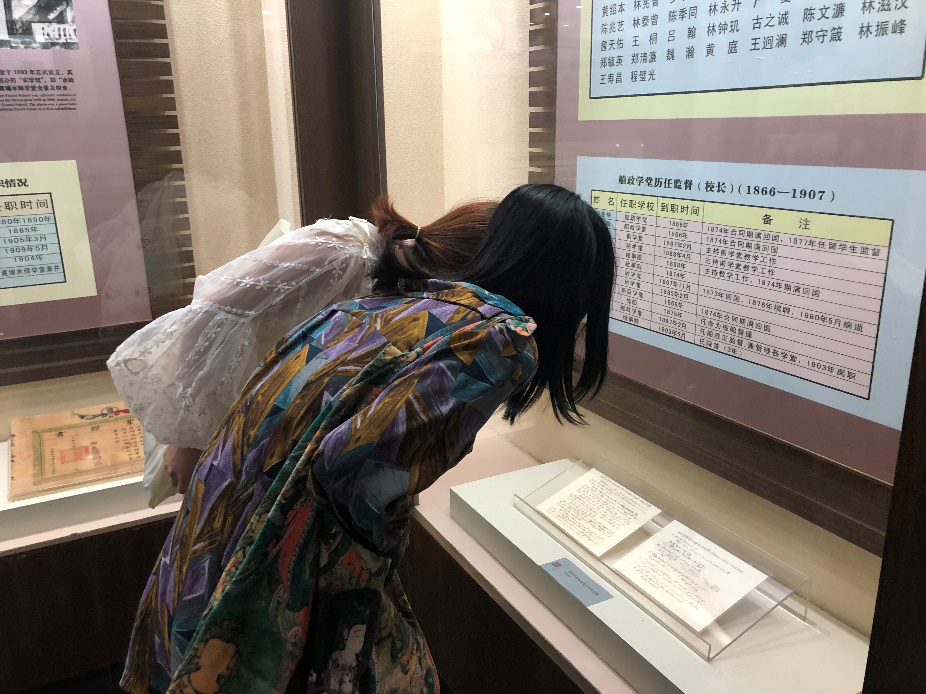 马尾船政博物馆一共有5层,展厅第一层为序厅,以浮雕和圆雕组合,展示船政总体概况。第二层为"船政概览",介绍左宗棠、沈葆桢创立船政之艰辛,集中反映船政之最。第三层为"船政教育",主要介绍"船政学堂"和培养出的船政精英。第四层为船政工业与科技,有制作的船模,介绍船政造船技术的发展过程及科技成果。第五层为"海军根基",突出近代海军的形成、船政十三厂造舰船的规模数量、地位,船政学堂培养的海军将领,同学们在参观之余互相讨论,也对船政的历史更加了解。