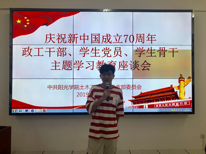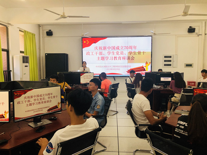 9月30下午,阳光学院土木工程学院党总支在BIM实训室召开“庆祝新中国成立70周年政工干部、学生党员、学生骨干主题学习教育座谈会”。座谈会由总支书记叶润真老师主持,土木工程学院辅导员、学生党员代表、学生骨干参加本次会议。