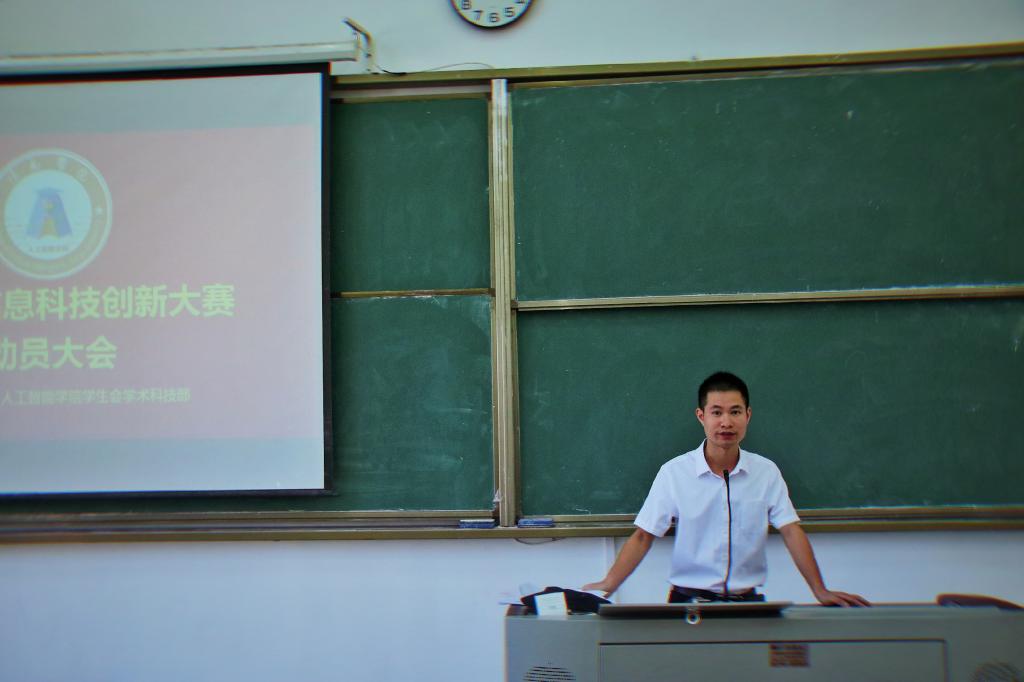 随后,电子信息类比赛指导老师代表刘文财老师上台发言,他首先向同学们解析了电子信息类的比赛事宜,并表明了自己的观点。他指出,在人工智能、区块链技术盛行的今天,学生们应该积极参加信息科技创新比赛,从而积累经验,更好的向省级大赛、国家大赛发起挑战。