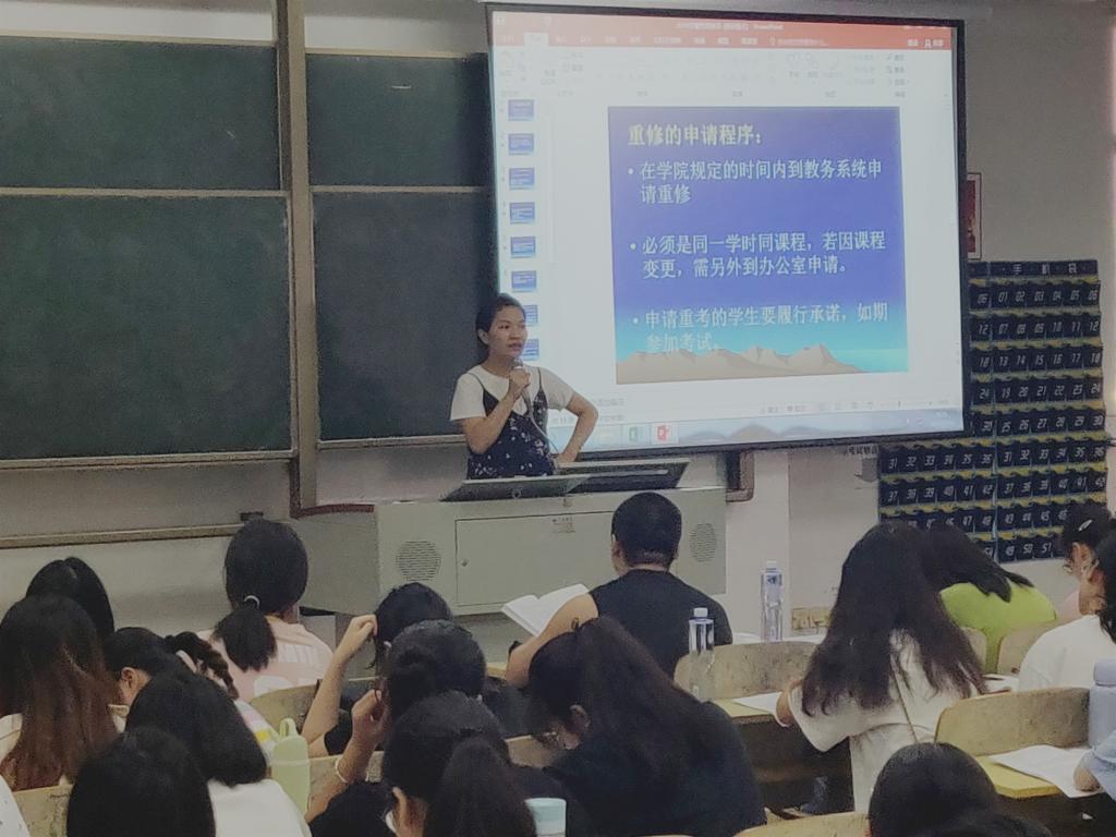 2019年9月11日,为让新生们更加了解我院学藉管理制度,更好规划大学学习生活,我院举行2019级学藉管理教育,由院教学秘书王微微老师主讲。王老师主要讲解了各专业的修读指南,指导学生了解自己未来学习生活中必须修满的毕业最低学分以及必修课、限定选修课、任意选修课、实践课程的区别。同时讲解了常见的教学以及学籍的相关事项,如重修、旁听、免听等事宜。另外指导学生使用教务系统的方法。