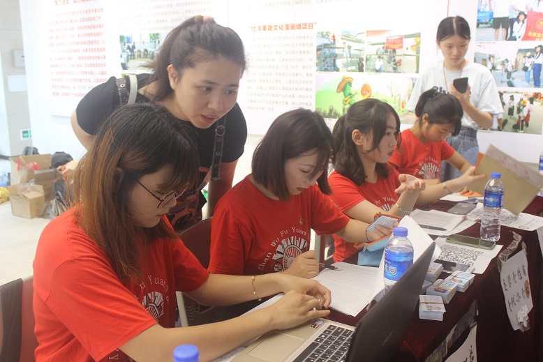 夏末秋初,正是迎新时。2019年9月7日早上七点时分,在外国语与海外教育学院党总支书江烨欣老师的指导下,党员服务站的干部们在行政楼一楼大厅迎来了2019级的萌新们。他们忙碌的身影形成了耀眼的“红色”光芒也成了迎新中一道亮丽的风景线。党员服务站的学生干部们坐在外国语与海外教育学院迎新报到区,积极为报到的新生们检验录取通知书、分配宿舍、发一卡通、校徽、给家长宣传单和拍照等事宜,并耐心的回答新生和家长的问题,及时给予帮助。