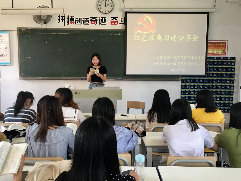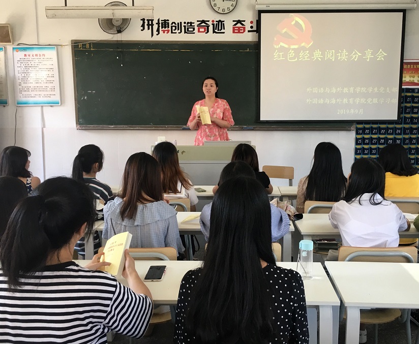 为进一步继承和发扬党的优良传统和作风,大力宣传红色精神,提高党支部成员学习红色精神的积极性和自身党性修养,外国语与海外教育学院党总支于2019年9月26日在文科楼402,出席本次的红色读书学习分享会有学生党员以及学生骨干。
