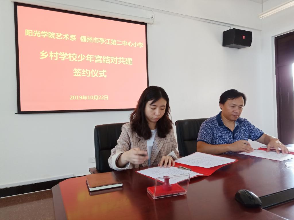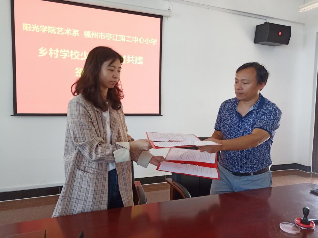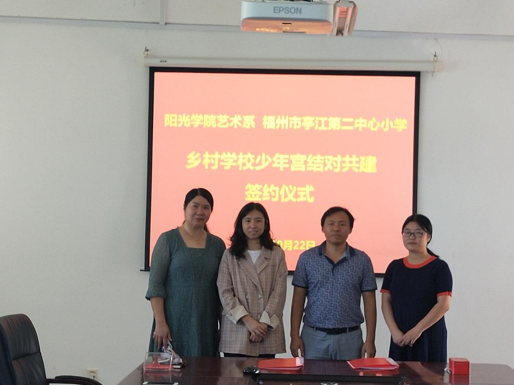 为深入贯彻落实习近平总书记关于教育的重要论述和全国全省教育大会精神,践行《中共福建省委文明办中共福建省委教育工委〈关于组织开展乡村学校少年宫共建活动的通知〉》文件精神,探索建立高校支持中小学美育协同发展机制,开展文明校园与乡村学校少年宫结对共建活动,阳光学院艺术系与福州市亭江第二中心小学经双方协商达成结对共建协议。10月22日,双方于福州市亭江第二中学举行签约共建仪式,艺术系党总支书记朱恬恬、亭江第二中学郑云校长、第二中学少先队总辅导员黄碧华老师、阳光学院艺术系学生党支部书记王苗苗出席了仪式。