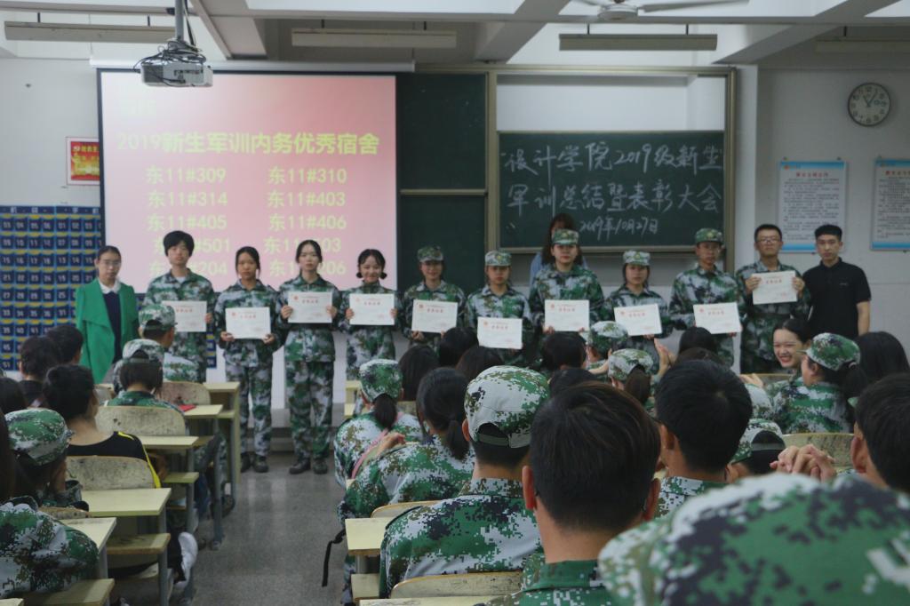 会上,党总支书记宋海霞宣读了设计学院军训表彰决定,对获得军训优胜单位、分列式会操优胜单位、军训优秀学员及军训优秀内务卫生的宿舍进行了表彰。颁奖环节结束,军训优秀学员代表买靖勋发言,他讲述了他在短短14天军训中所发生的故事,从一开始的认为站军姿很累再到后来的军姿是军训中最轻松的一部分,2019级新生为之动容,感同身受。他说军事训练的磨练使得他学会到了用智慧与毅力克服困难,明白“只有坚持到最后,胜利的曙光才是属于我们的。”为期十四天的军事训练不仅锻炼了身体素质还收获了深深的同学情谊。