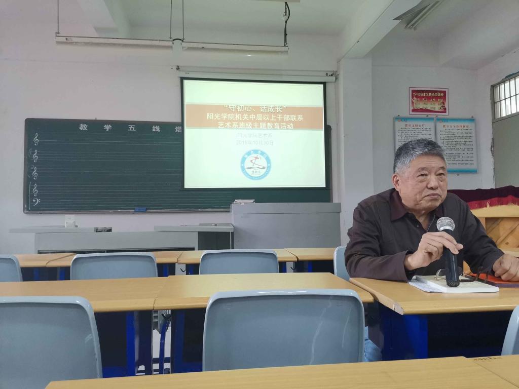 为学习践行党的十九大精神,进一步贯彻落实全国高校思想政治工作会议和《中共中央国务院关于加强和改进新形势下高校思想政治工作的意见》精神,将高校思想政治工作落细落实,艺术系积极开展阳光学院机关中层以上干部联系班级活动。