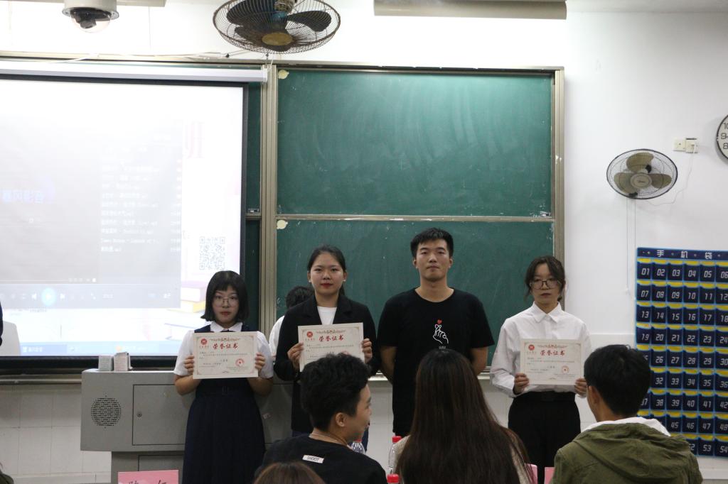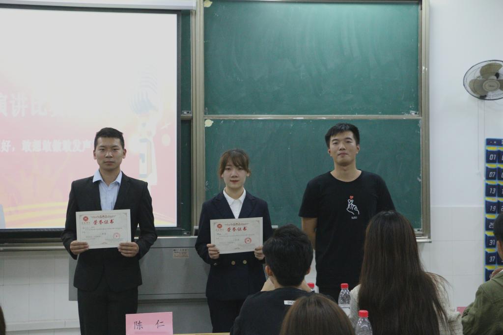 一番激烈的角逐后,由校学生会主席王笑对本次比赛进行总结,她先是表扬了本次参赛选手,认为他们都能够很好地表达自我的想法,同时也提出了问题所在:脱稿人数较少、准备不够充分、语言过于平淡等,并点出了本次演讲比赛优秀选手及令其印象深刻的原因。活动尾声由主持人公布此次竞赛评分以及名次,张佳梅选手荣获一等奖,孟小山选手和罗慧琳选手荣获二等奖,唐炫选手、倪煜青选手、伊嘉欣选手荣获三等奖,设计学院学生会主席李雪鑫、副主席陈仁为获奖选手颁奖。