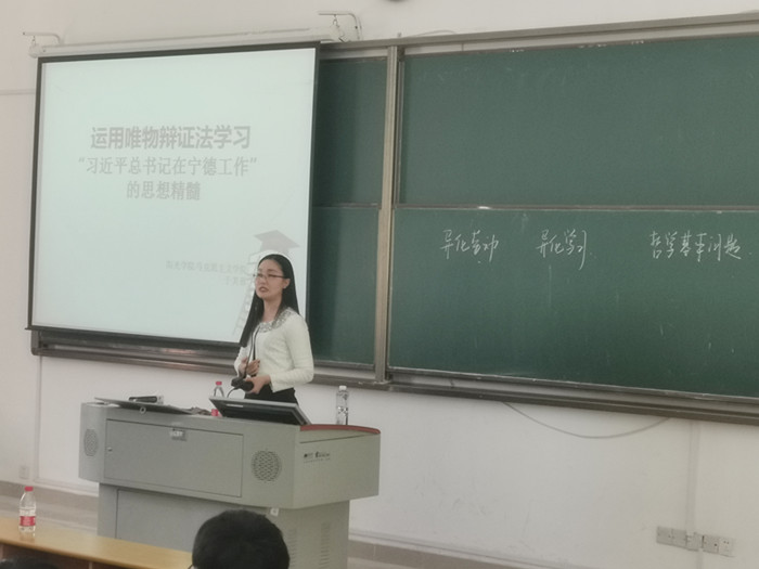 于芙蓉老师通过“异化劳动、异化学习”两者间的关系引入本讲主题:运用唯物辩证法理解“习近平总书记在宁德工作”的思想精髓。同时为同学们重温了唯物辩证法的相关知识点。“透过现象探究本质”是芙蓉老师为我们解析“习近平总书记在宁德工作”的要点之一,同时也重点为同学们解答了“我们为什么要把马克思主义普遍真理和中国具体实际相结合?”运用唯物辩证法剖析习近平同志在宁德的施政密码,不仅让同学们深入学习了“习近平总书记在宁德工作”一个个鲜活的故事、一个个具体的细节,生动再现了习近平总书记当年为带领闽东百姓摆脱贫困呕心沥血的感人画面。