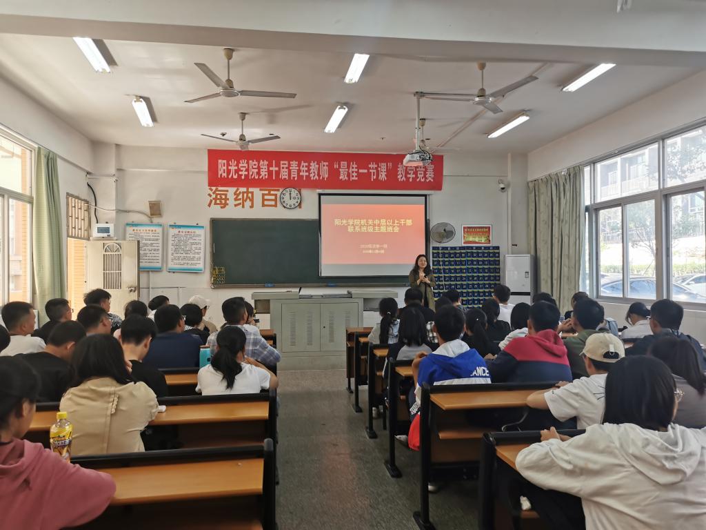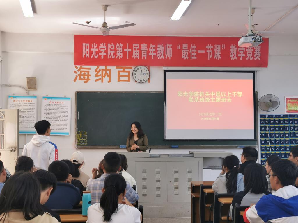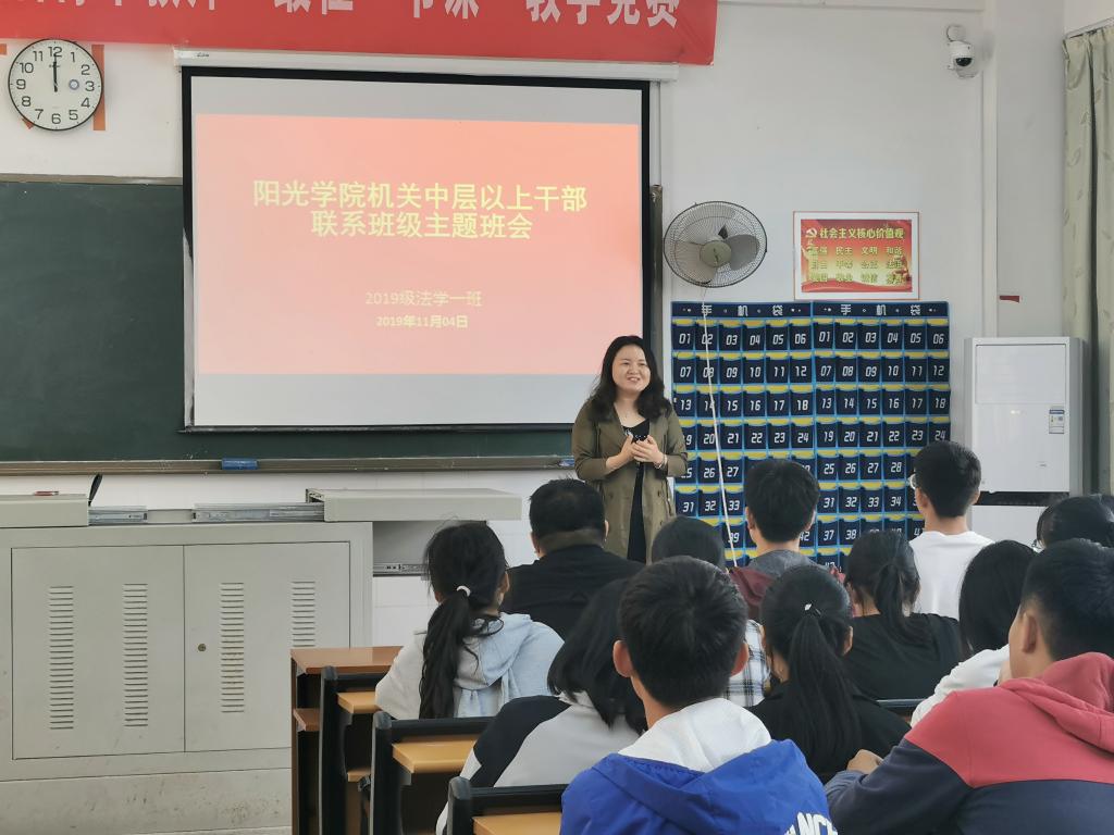 为深入贯彻阳光学院关于中层以上干部联系学生班级制度,促进校领导与学生之间的交流,积极推进学生管理和德育工程,从而更了解学生的需求和对学校的认识。法律系2019级法学1班于11月4日中午,在文科楼101开展“阳光学院中层以上干部联系班级主题班会”,党委宣传副部长郑丽香老师、法律系2019级辅导员汪文坤老师以及2019级法学1班全体同学参加了此次会议。