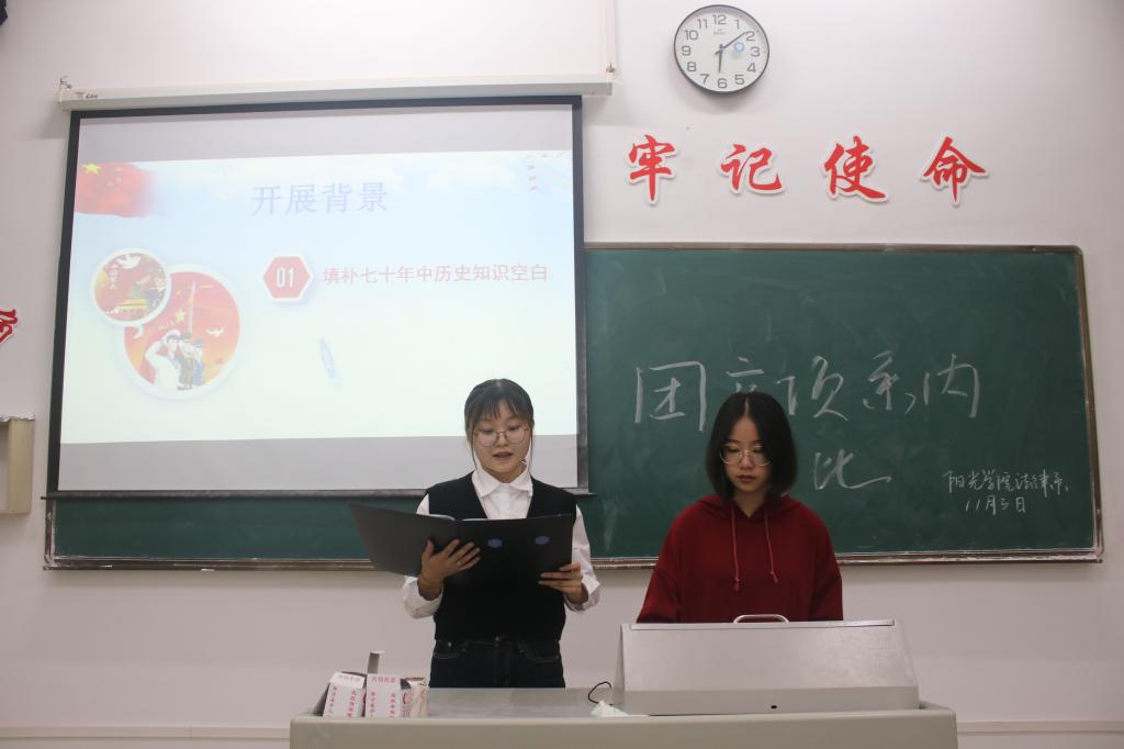 为庆祝中华人民共和国成立70周年,贯彻习近平新时代中国特色社会主义思想,提高法律系学子凝聚力,响应新时代青年人“不忘初心,牢记使命”的号召,我系于11月3日在工科楼A208举办了以“不忘爱国之心,牢记青春使命。风雨七十载,筑梦新时代”为主题的团立项评比活动。本次活动由团委书记汪文坤老师、团委学生会主席团成员担任评委。