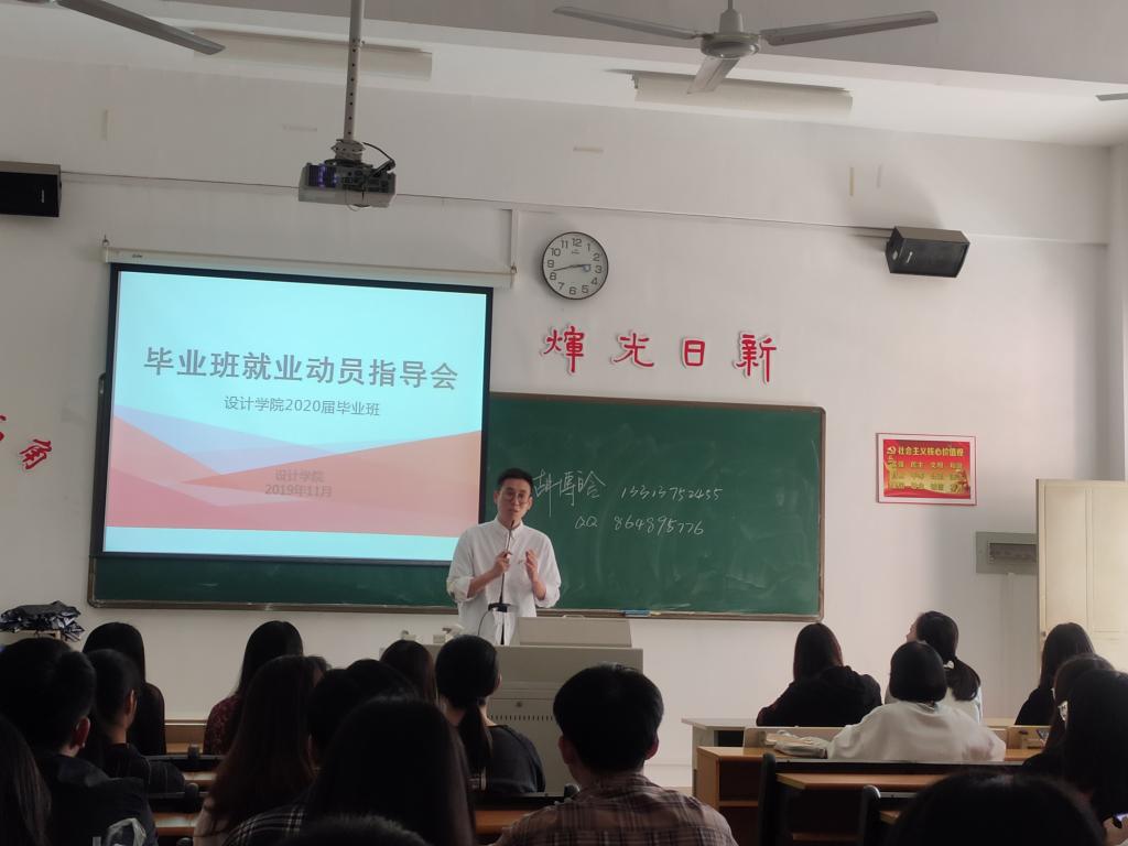 为积极推动毕业生就业工作。2019年11月13日,在辅导员胡博晗老师的组织下,2020届毕业班同学聚集在工科楼211教室举办了以“毕业班就业动员大会”为主题的会议。本次会议由16级设计学院辅导胡博晗老师主持。