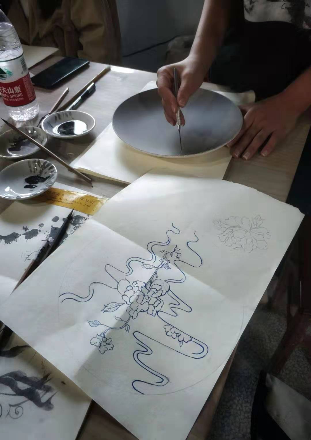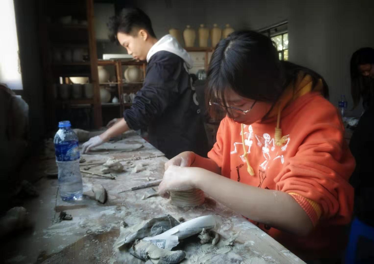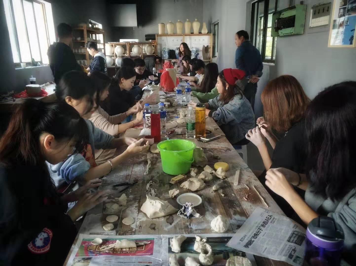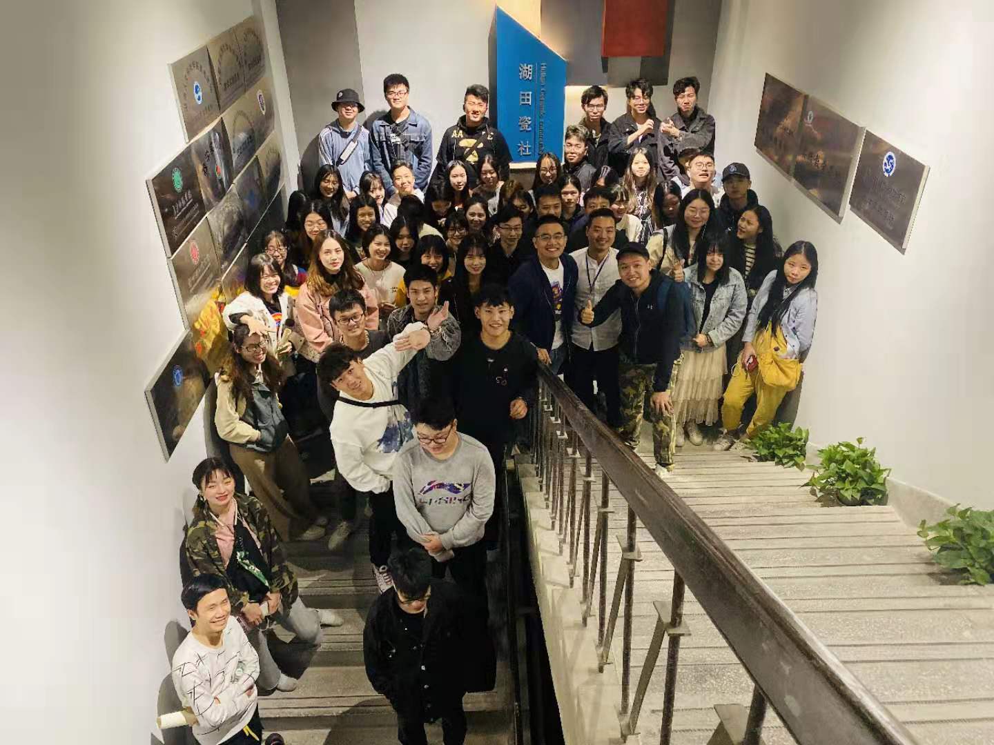 在5天的研学过程中,同学们首先参观了中国陶瓷博物馆,了解了千年瓷都——景德镇的历史文化,景德镇瓷器造型优美、品种繁多、装饰丰富、风格独特,以“白如玉,明如镜,薄如纸,声如磬”的独特风格蜚声海内外。第2天开始,在湖田瓷社开始了为期3天的陶艺研学工作坊,工作坊负责人首先为大家开了一堂生动有趣的讲座,以“我和陶瓷的故事”为题,向大家介绍了他从一个陶瓷爱好者一步步成为陶瓷艺术家再到跨界学者的历程。鼓励同学们跳出自己的舒适圈,不要被禁锢在自己熟悉的环境中,要勇于尝试新鲜事物。研学课程首先临摹了有上百年历史的古瓷片,同学们对古瓷片上的传统纹样产生浓厚的兴趣;之后再根据自己的创意,将古瓷片的图案转化成自己的图形。再将图形运用到瓷盘,瓷杯上。在成型的瓷器上画青花、运用了撒蓝的工艺,把临摹古瓷片花纹运用到自己的制作中。此外,动手参与制作瓷器成型的第一道工序——拉胚。研学期间,师生一同观看了陶溪川美术馆里逆行迁徙的陶瓷展,参观了5A级景区中国古窑,了解了窑神童宾的历史故事,观看了瓷音的表演,参观瓷器工艺制作的作坊和烧窑的动画,详细的了解了瓷器制作的步骤。