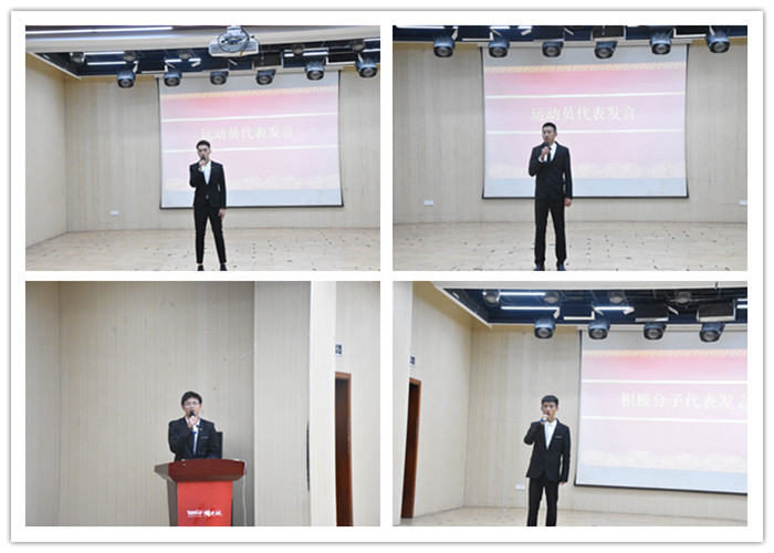 大会进行下一项,运动员代表庄凯喆、吴明杰,“最佳组织奖”班级代表苏诗阳同学,运动会积极分子代表沈榕鋆同学上台发言。庄凯喆同学对运动员训练和比赛期间的感受与对他们的未来期望,吴明杰同学的亲身经历,苏诗阳同学对班级的赞扬,沈榕鋆同学对全体运动会工作人员工作情况的感谢,无一不饱以真情实感,无一不透露我院学子为我院荣誉团结一致、奋勇争先的优良精神。