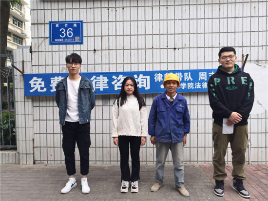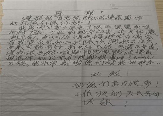 “太感谢你们了,幸亏有你们,我才要到了钱。”2019年11月30日中午,福州市马尾区务工的于先生拿着感谢信当面向阳光学院法律援助站的同学们致谢,福州市马尾区法律援助中心见证整个事情发生的全过程,对阳光学院法律援助站给予高度肯定。