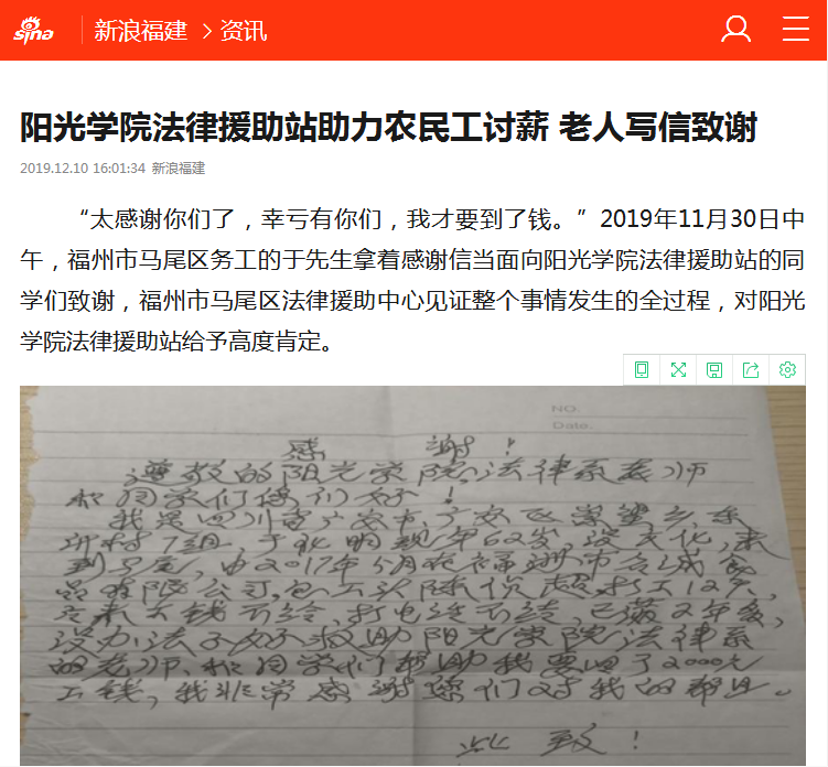 “太感谢你们了,幸亏有你们,我才要到了钱。”2019年11月30日中午,福州市马尾区务工的于先生拿着感谢信当面向阳光学院法律援助站的同学们致谢,福州市马尾区法律援助中心见证整个事情发生的全过程,对阳光学院法律援助站给予高度肯定。