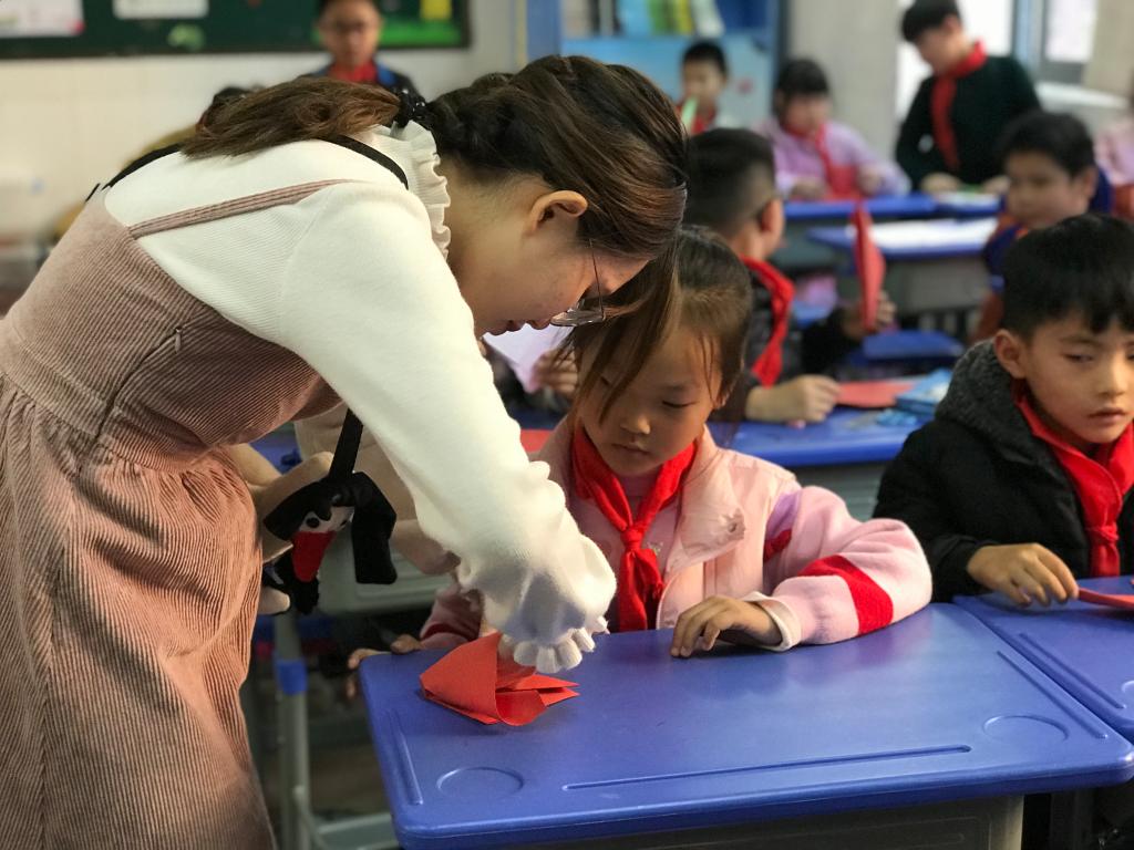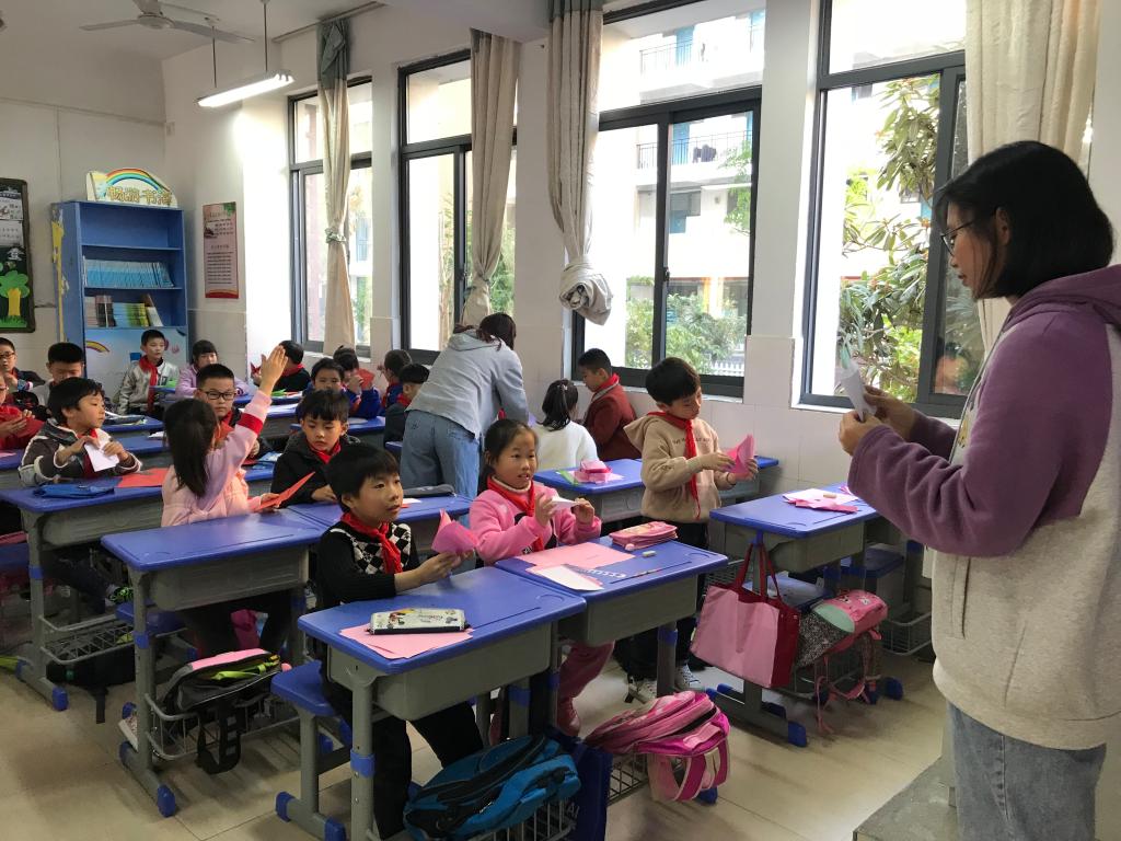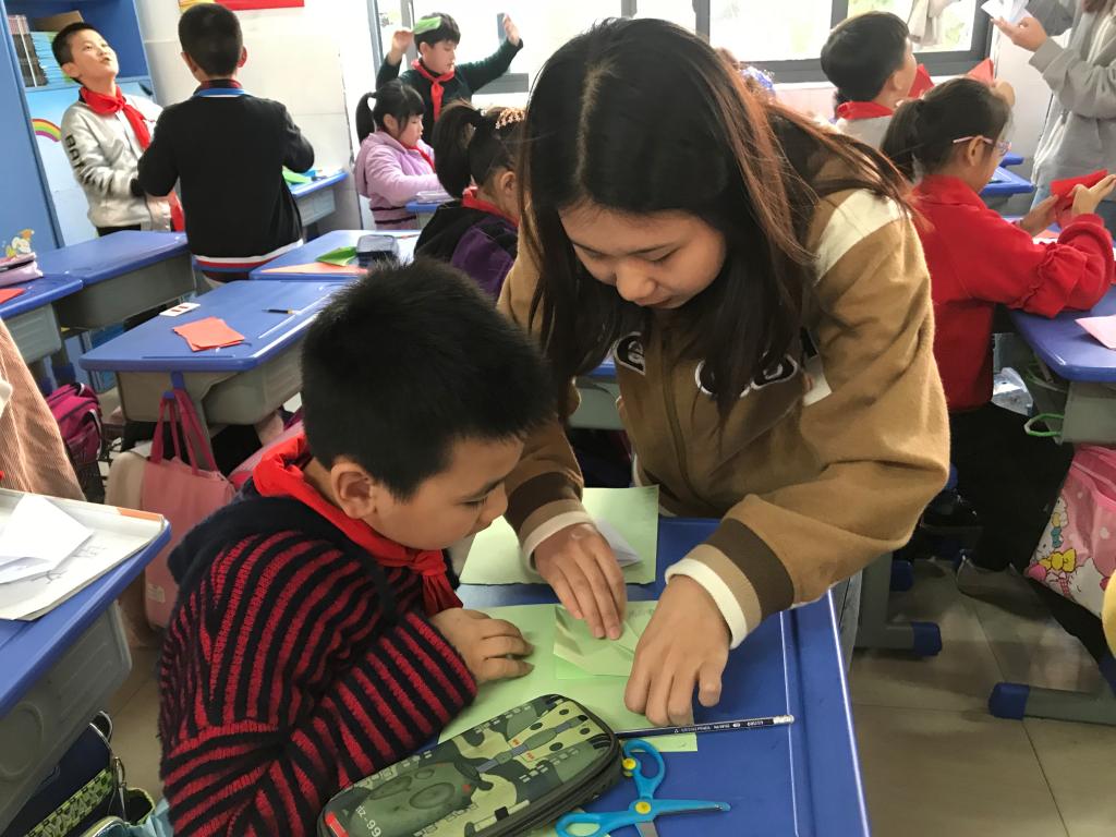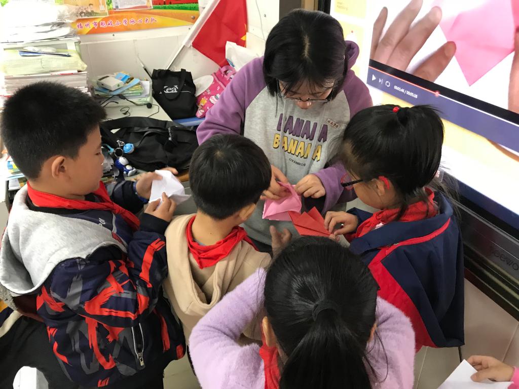 录制完成视频后由黄育秀主讲,其他志愿者默契配合一步步耐心指导小朋友们把自己的梦想与祝福折成千纸鹤,让千纸鹤把梦想与祝福带给未来的自己和家人老师。