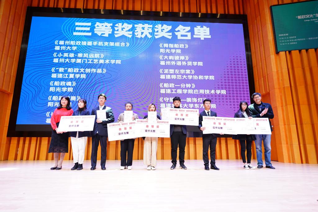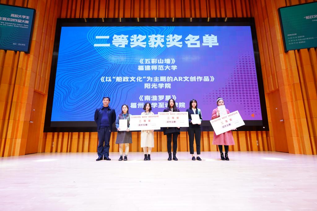 领导嘉宾、获奖师生和各高校师生代表近300余人参加了颁奖晚会,颁奖晚会在慷慨激昂的管乐声中拉开序幕,会上,嘉宾为获奖项目颁发了证书与奖金。专家评委从不同的角度评选出了最具市场价值奖、最具人文魅力奖及最具工艺创意奖。福建师范大学、福建工程学院等7所省内高校获得“最佳组织奖”,阳光学院获得“特别奖”。获得一等奖的作品进行了现场路演,独特的创意、精美的工艺、巧妙的设计……各种“奇思妙想”备受师生喜爱。由阳光学院学生带来的集体朗诵《八闽文脉,百年船政》将颁奖晚会推向高潮,百年船政承载着无数爱国先驱用血肉铸就的强国梦,精彩的诗歌朗诵激发起现场学生的爱国情怀。