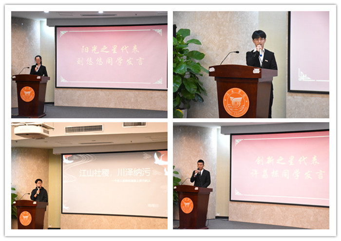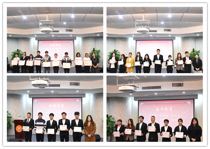 会议伊始,党总支书记叶润真老师宣读表彰决定。随后进行颁奖环节。首先进行阳光学院最高学生荣誉奖项“阳光之星”的颁奖环节,我院大四学生共有31位受此表彰,并由刘悠悠同学作为阳光之星代表发言。随后进行“学习之星”、“运动之星”、“创新之星”、“文艺之星”、“奋斗之星”的表彰环节,并分别由倪文威、吴明杰、许荔栋、杨稷川、程彬彬五位同学作为代表上台发言。发言结束,进行“出彩阳光人”的表彰环节,我院共有六位同学在各方面表现出彩,获此荣誉,并由三位退伍大学生作为代表,进行《热血军魂》个人事迹演讲。他们的热血军魂与赤胆忠诚历历在目,让现场学生为之感动。最后进行的是2019年团学“优秀部门干事”的颁奖典礼,为我院学生工作默默奉献的新生干事进行激励。