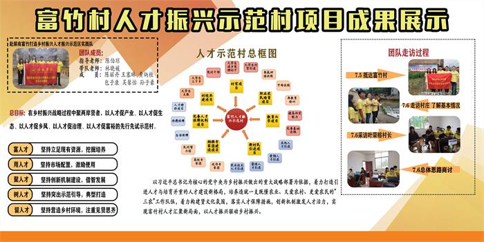 在7月7日,实践队根据之前的实地考察分析,发现乡村振兴既要引进人才,更要培养本地人才,进一步对人才引进方案进行修改和完善。同日下午,实践队请教了王秉安教授关于建设人才振兴示范村的总框架设计,王教授也对此提出了一些可行性的建议,实践队根据王教授的建议制定了有关人才振兴项目的目标规划。