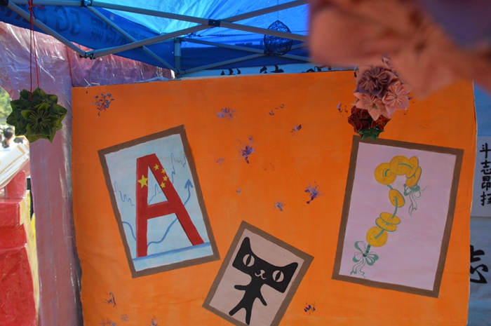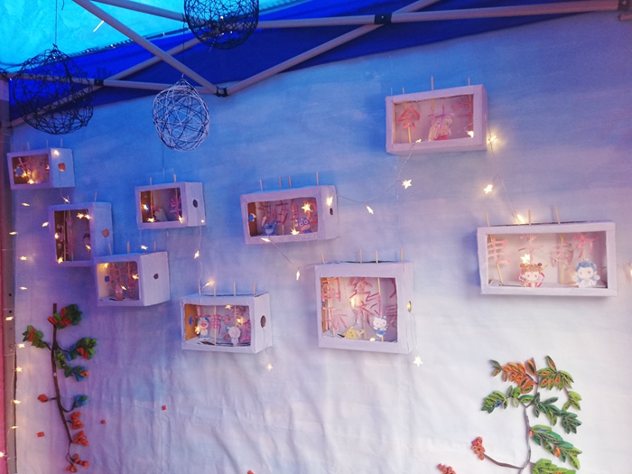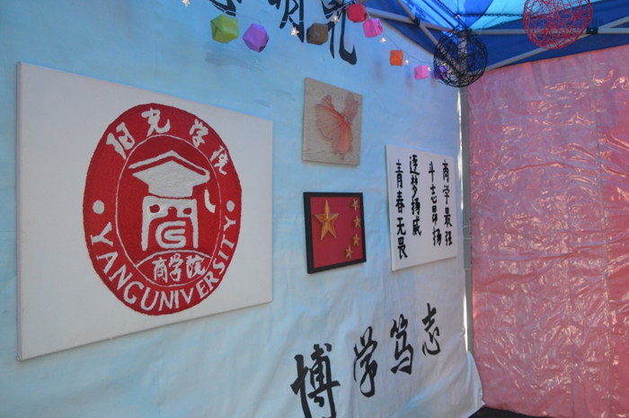 我院大本营起名为“商学园”,寓意为商学乐园。在大本营内,其中一面墙上有分别采用中国传统剪绒技术制作的商学院院徽和口号的手工作品,还有用钉子画做出的中国地图和国旗的钉子画。这四副手工作品不仅展示了中国七十年来的发展变化,更体现出了我们商学院的光辉与荣耀。另一面墙的名字叫做“我想对你说”,上面写着我们商学院同学对我们的运动员的寄语。在墙的另一面采用灯光秀的形式向大家展示了商院的九大专业,表示每个专业都有自己的舞台 ,灯光连在一起就是我们整个商学院大家庭!